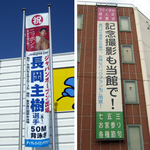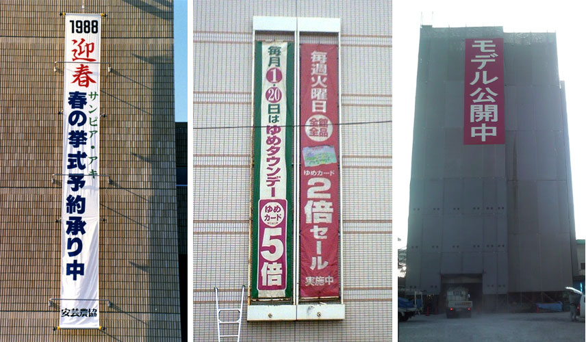 同じ用途で、縦長になった幕を垂れ幕(懸垂幕)と呼びます。