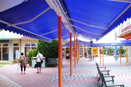店舗用デザインテントは、お客様のニーズに合わせた形を好みの色で製作する事ができます。